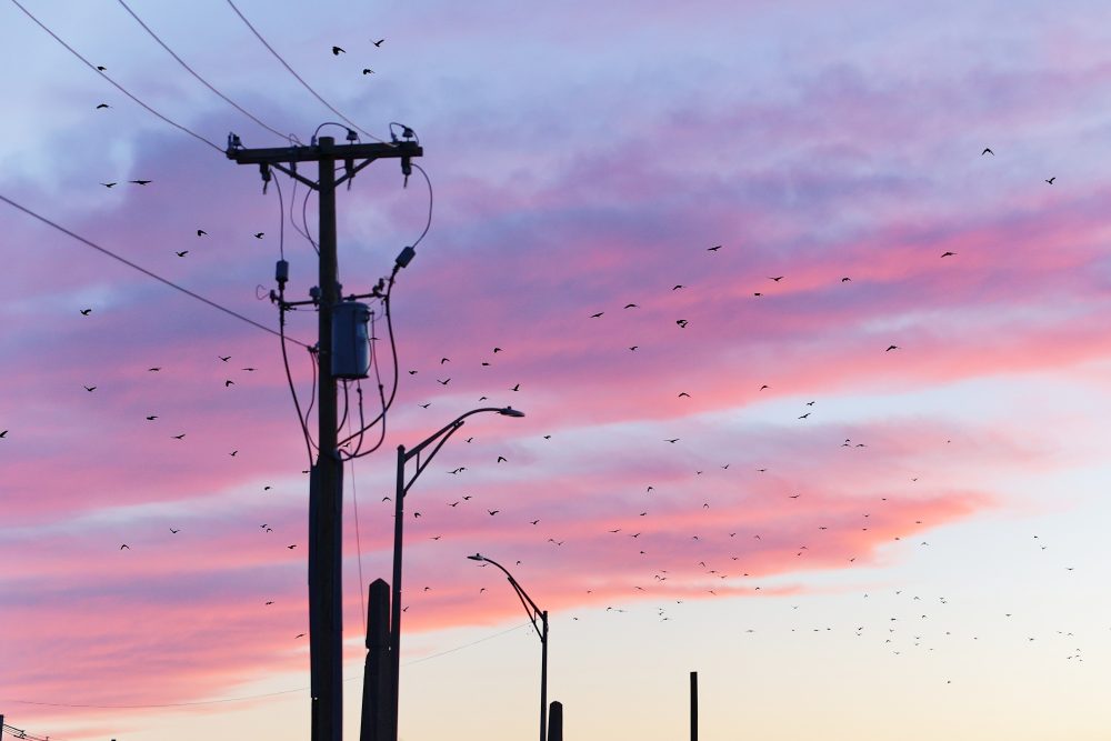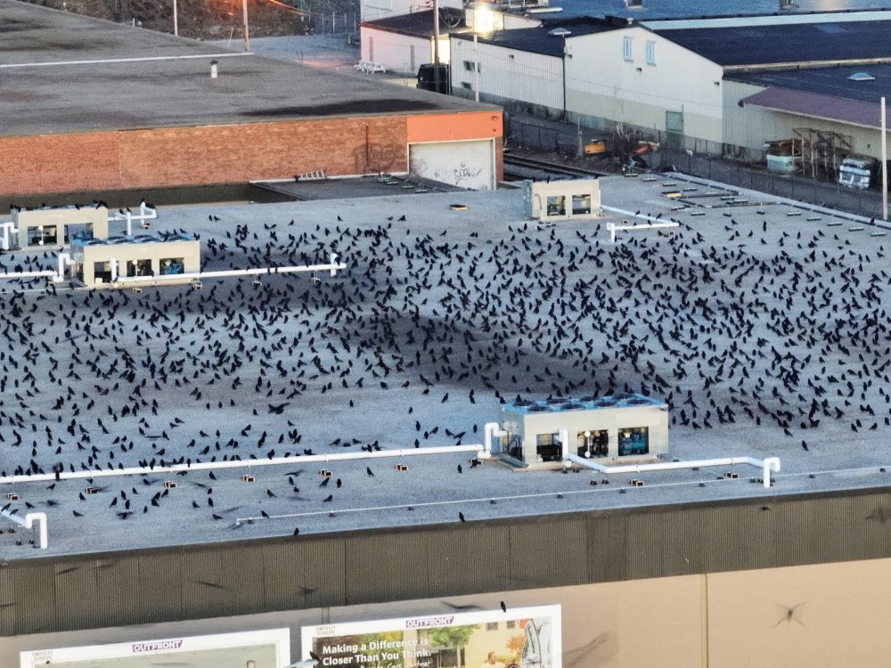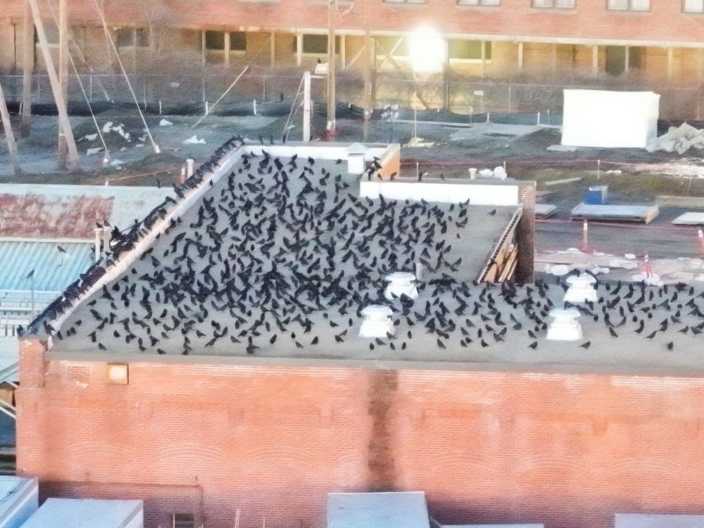 A bit later, numbers built up within the National Grid substation, adjacent to the Merrimack River, on rooftops, utility wires and on the ground. Minutes later, the Crows converged into the long spread of treetops along the Merrimack River between the National Grid substation down close to the Casey Bridge. They will undoubtedly shift further and finally become concentrated in the trees by the New Balance building. Image below shows Crows on a red brick building rooftop and roof edges within the substation. Another amazing night out on Crow Patrol!