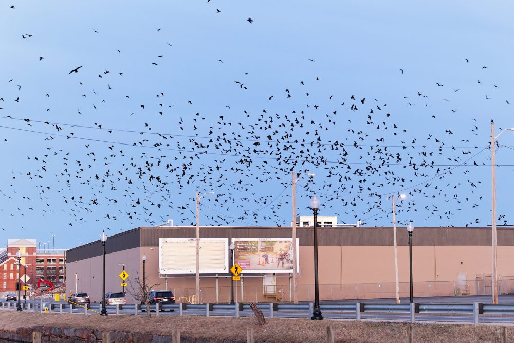 The Crows were staging in large numbers on rooftop of the former B&D warehouse building along Merrimack Street. As we carefully deploy aerial imaging tools with high powered 7X zoom cameras, and established buffer zones, we are able to realize new insights on staging movement patterns and enhance more accurate counting techniques; a real game changer. Image below at 20 minutes post sunset time.