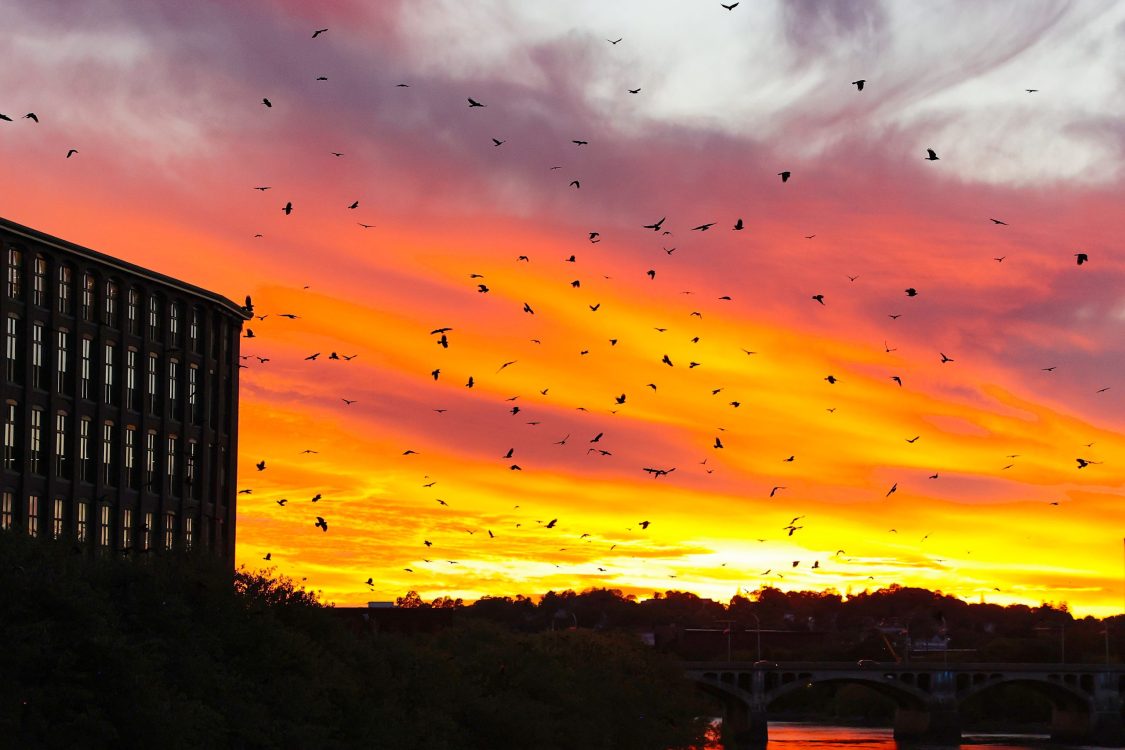 For decades, the city has hosted a significant winter crow roost. The winter crow roost consists of mostly American Crows, along with a smaller number of Fish Crows. Typically, an hour before sunset, the crows gather in smaller pre-roost groupings. These pre-roost (staging) locations may change on any given night. The crows then converge about a half hour after sunset, into a final roost location. For many years, the final roost location had been along the south side of the Merrimack River, by the New Balance building complex. Over the winter of 2017-2018, and 2018-2019, the final roost location changed many times. Since October 2020, the roost has continued along the Merrimack River from the New Balance building, downriver as far as the Rt. 495 bridge, and an extended area around Lawrence General Hospital. The size of the winter roost typically grows from an initial group of 2,500 in October to almost 15,000 crows in late January and early February!