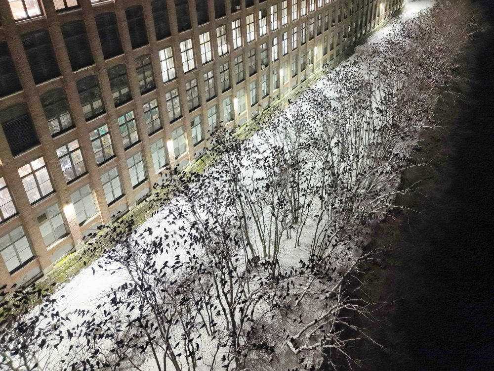 The first aerial image, captured in natural-color (RGB) just after dusk, looks along the line of riverside trees bordering the Merrimack River near the New Balance building. From this angled perspective, the early structure of the roost becomes clear, with crows already well settled into favored trees. The soft ambient light highlights silhouettes of birds spaced along branches, revealing the orderly foundation of what will soon become a densely packed overnight roost.