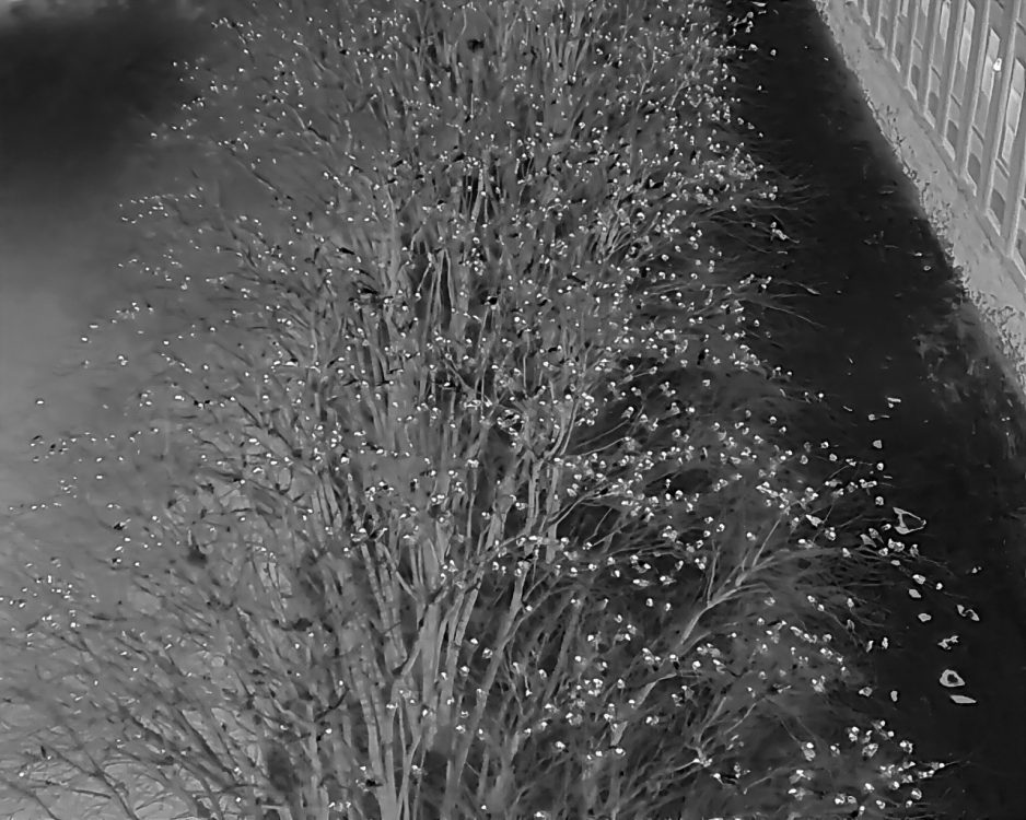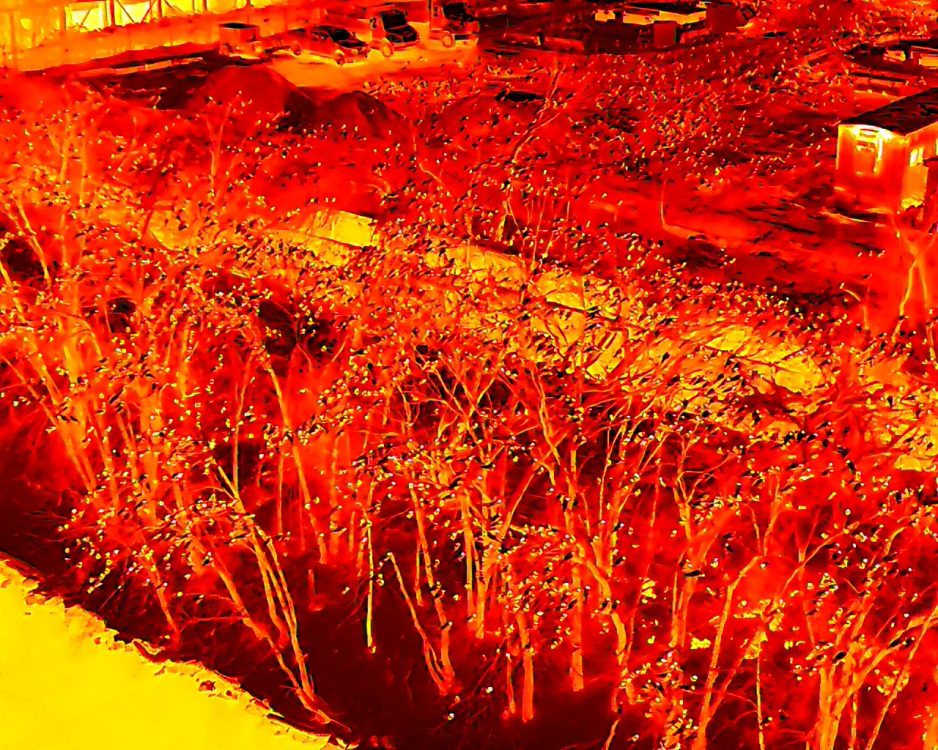 The third image looks straight east down the length of the riverside trees alongside the New Balance building, using a white-hot thermal palette. From this viewpoint, the sheer density of the roost is unmistakable. Tree after tree appears fully occupied, with the brightest signatures marking concentrations of birds packed tightly into the canopy. This perspective beautifully illustrates both the scale and uniformity of the roost as it stretches along the river’s edge.