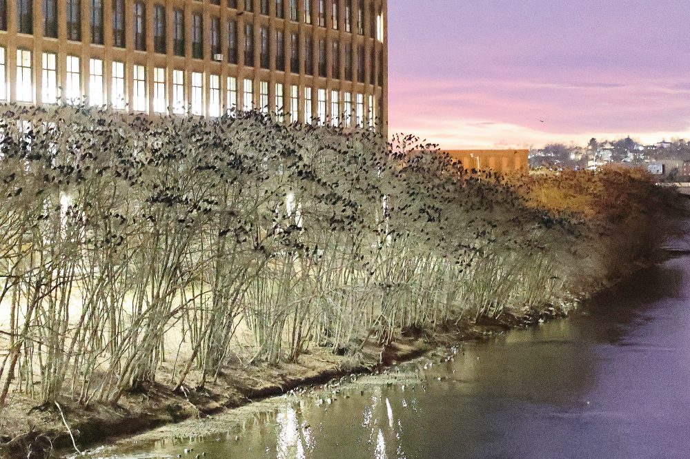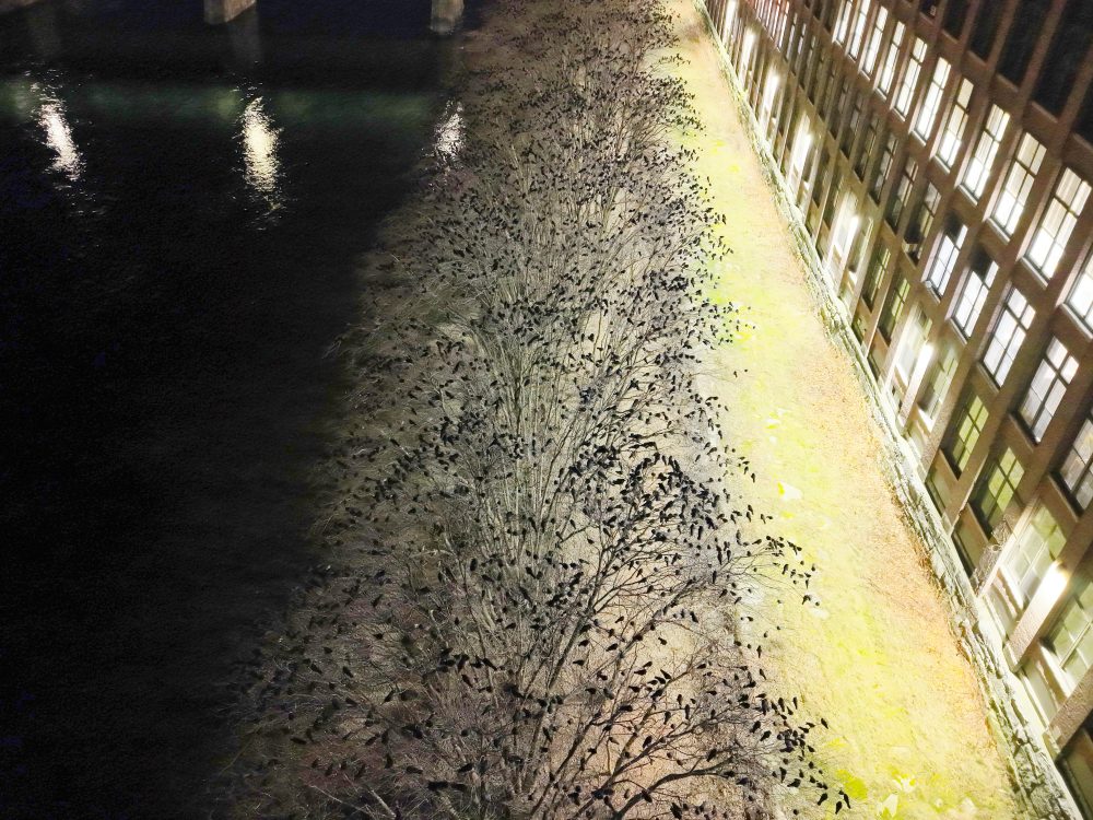 About fifty minutes after sunset, we moved west to the primary overnight roost near the brick New Balance factory building. From the Duck Bridge, looking west-southwest, the view revealed crows well settled into the riverside trees along the Merrimack. Soft ambient lighting from the building reflected off the water and branches, highlighting the quiet order that follows the earlier chaos.
