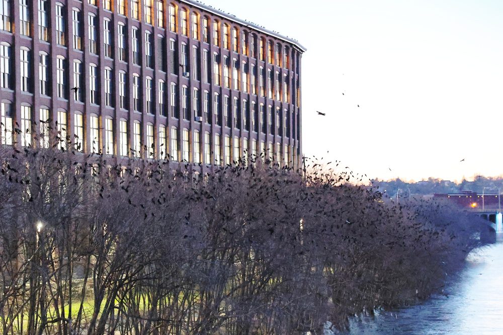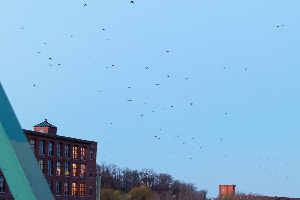 By 30 minutes past sunset time, the roost trees along the Merrimack River started to fill up with Crows. The largest concentration was towards the west end of the New Balance building and behind the National Grid substation. This image was also captured from the Duck Bridge.