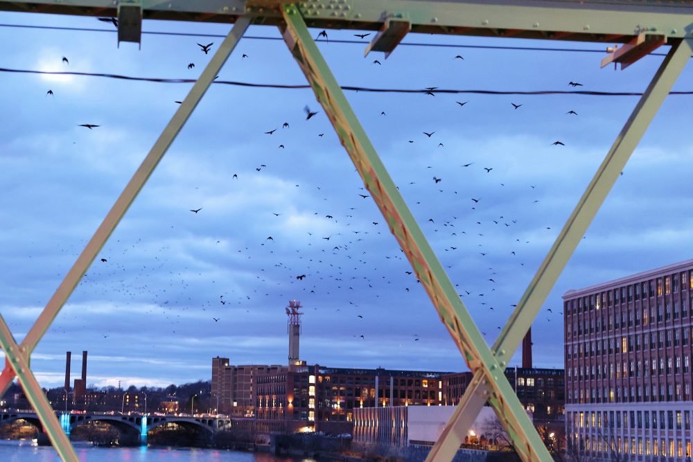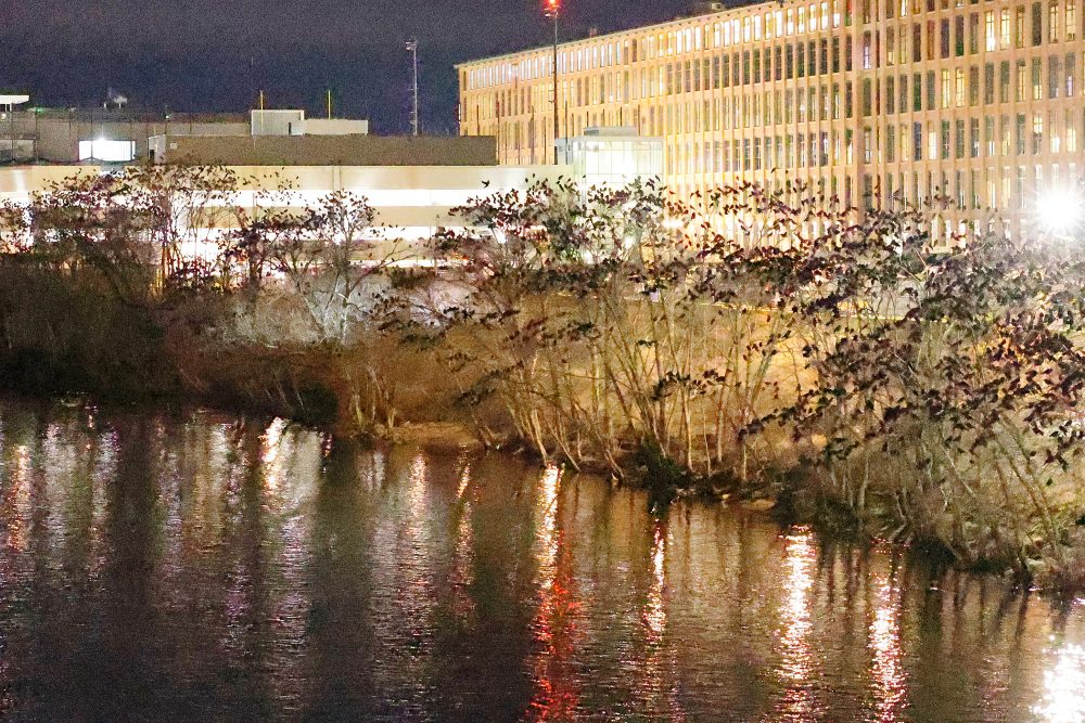 Out on Crow Patrol with initial stops at staging areas downriver with streams of incoming Crows all around. Moved to the Duck Bridge as base for tonight’s primary vantage point. Due to cloud cover and cooler temps, the Crows started to arrive in flight streams from upriver with many circling above the parking lots behind the Riverwalk complex, and then landing on the Riverwalk roof top. Image below at 16 minutes post sunset time.