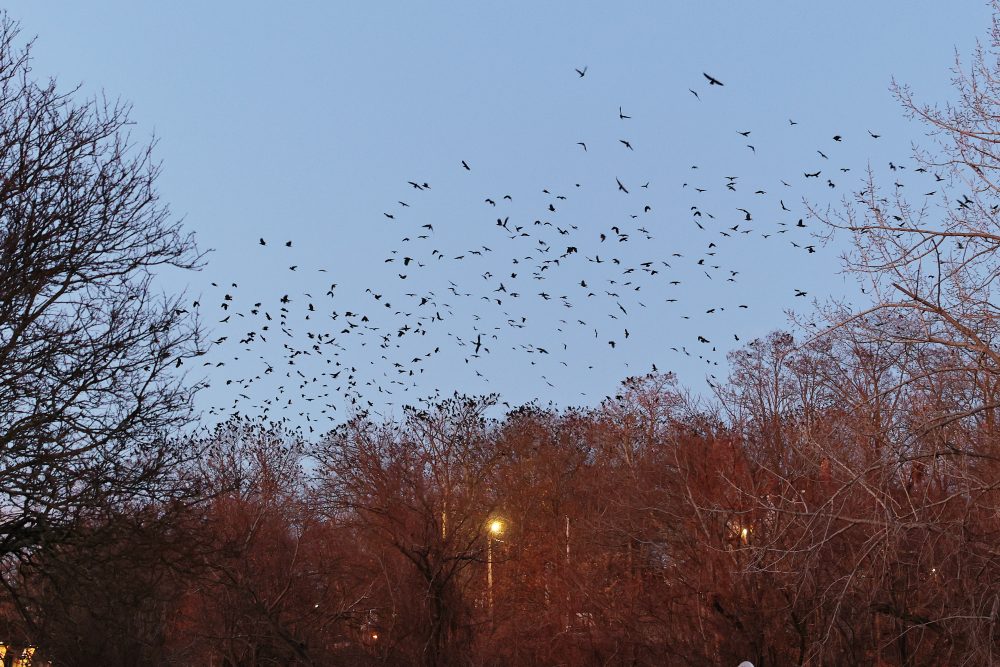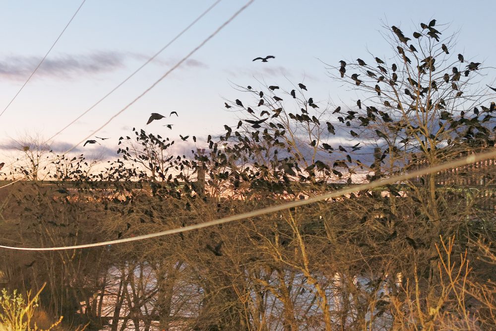 The Crows converged into the roost area behind the hospital starting about 25 minutes after sunset, and the numbers grew larger with later arrivals. Often times the Crows will leap frog over tree tops into the ultimate overnight roost area in waves of flight action. In this image the Crow in the back trees will leap frog over the ones closer to the overnight roost trees.