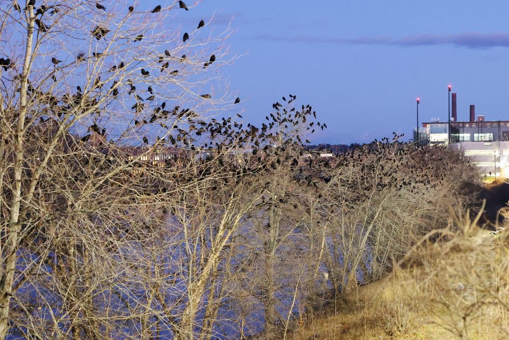 As a result of meaningful input from the National CBC Director, we are now using improved methods for counting the large number of Crows while streaming, staging, and settling into the roost. For all images, we use both a modified open source counting software program, as well as a direct block count approach, while standing outside (not sitting in a car after dark) around the roost, to carefully document our observations and to significantly increase reliability and accuracy of our well documented numbers. Please refer to our newly published Winter Crow Roost counting guide PDF on the main page.
