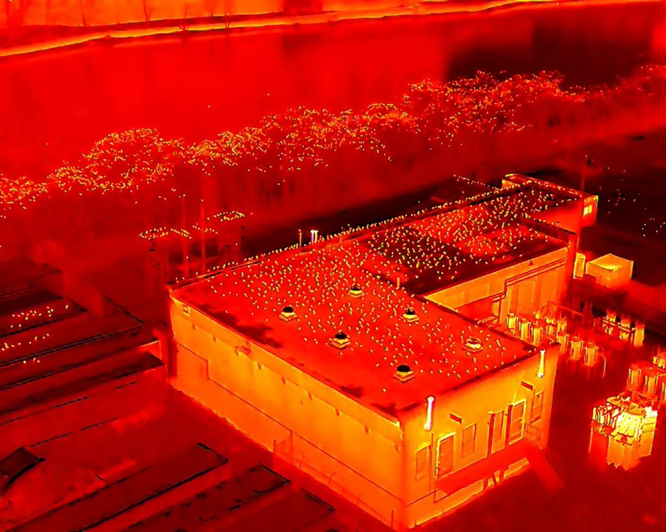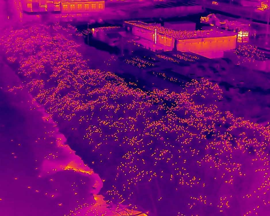 The Crow Patrol unfolded primarily along South Canal Street, with endless incoming flight streams and boisterous vocalizations signaling a roost that continues to consolidate and expand westward along the Merrimack River. This first aerial image, captured in the Fulgurite thermal palette, shows arriving crows covering the roof of a small red brick building within the National Grid substation. The spacing across the rooftop is relatively uniform, but densities increase noticeably along the roof edges. Behind the building, many more crows are already settling into the treetops along the Merrimack River, clearly signaling the transition from staging to overnight roosting.