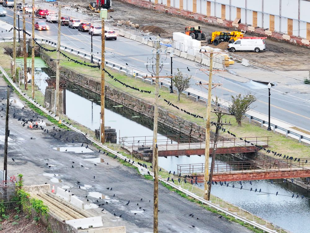 Upon arrival, scouted out nearby staging areas all along Merrimack Street, then made observations from South Canal Street with Crows vocalizing loudly and seen on the ground, rooftop edges, and utility wires before converging into overnight roost. It was fascinating to watch the equidistant line up of mostly Fish Crows along the utility wires on the south side of South Canal Street. Their almost uniform spacing may reflect social order, visual awareness, and readiness for a coordinated flight into the roost. This aerial view shows mostly Fish Crows tightly packed together on utility wires between multiple sets of poles.