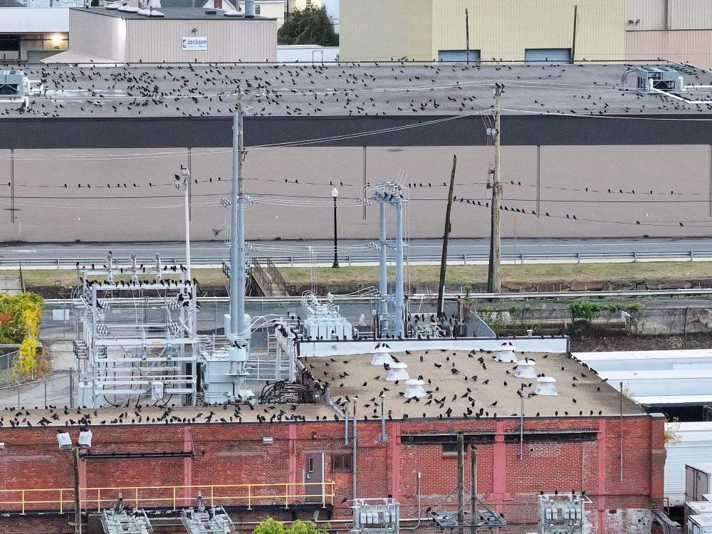 With a range of new aerial views we are much better able to view the buildup on nearby rooftops. This views provide a better sense of the overall numbers and how they arrive and build up in different but proximate rooftop locations. This view shows rooftops in the closer National Grid substation facility as well as the roof farther away on top of the warehouse building on the south side of Merrimack Street.