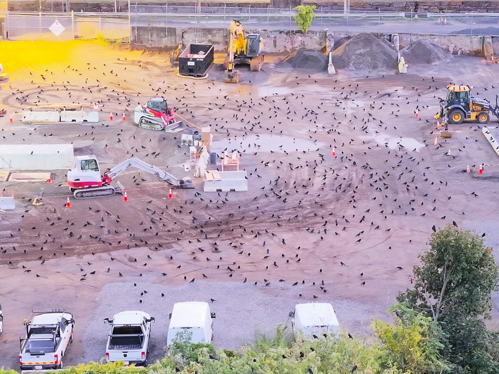 As these Crows gather together after sunset time, but before converging into the overnight roost, they are often seen on the ground in the National Grid substation. This aerial view not only helps to appreciate the spacing in between Crows on the ground, but also allows for accurate counting in a staging location. For most viewers it might be a surprise to know that this view shows just over 825 Crows on the ground!