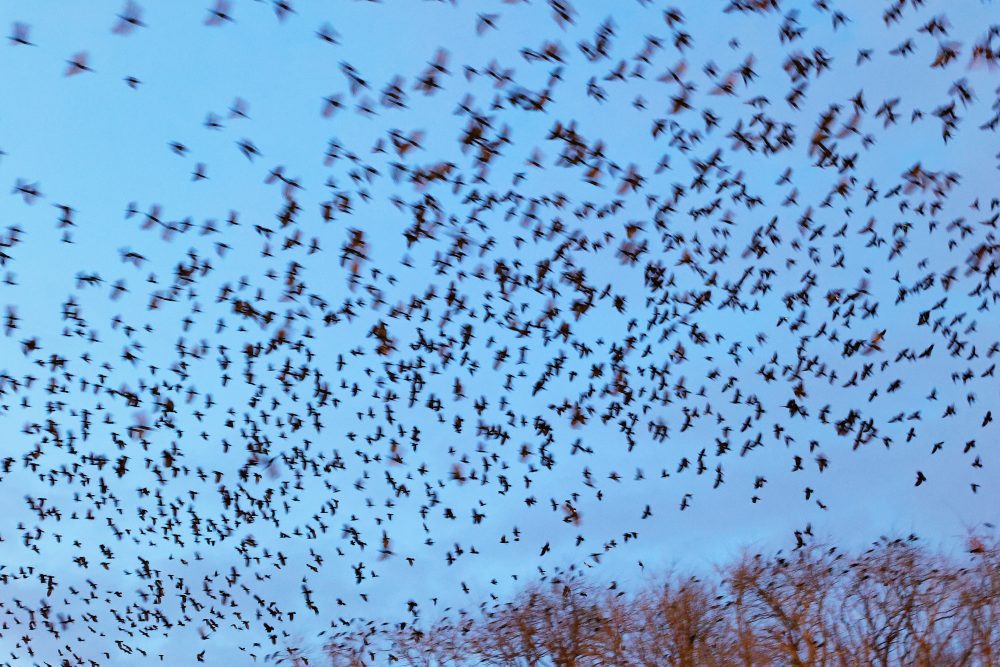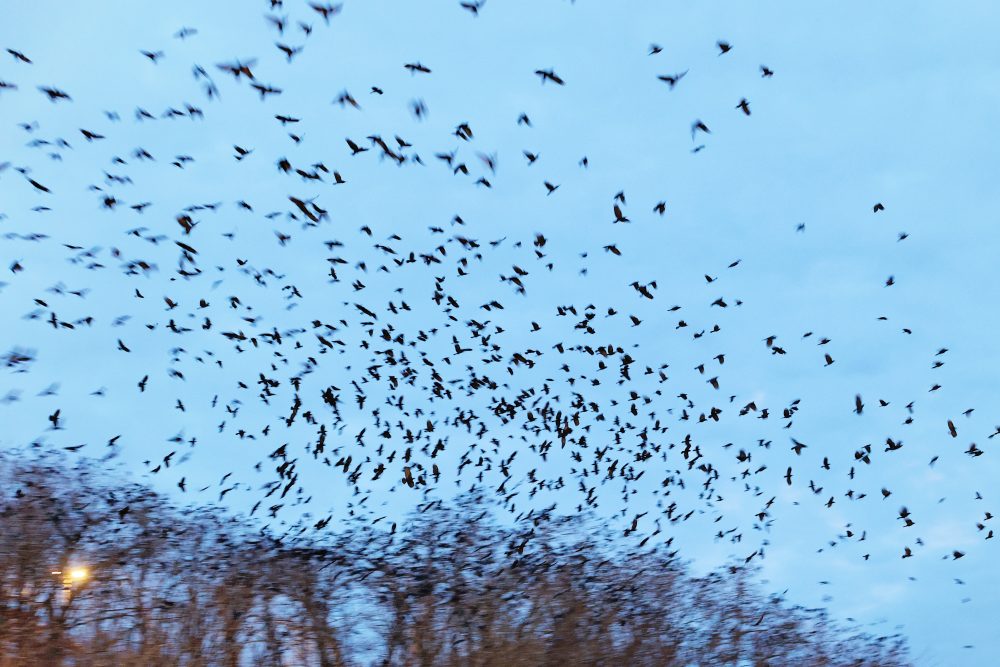As many more crows arrive, the swarm gets larger, and as the trees fill in, the size of the incoming flight streams grow exponentially. This creates a sense of total mayhem to the human observer, but it is very normal for the Crows and all part of arriving to the overnight party and getting settled in for the night. This image at 35 minutes post sunset time.