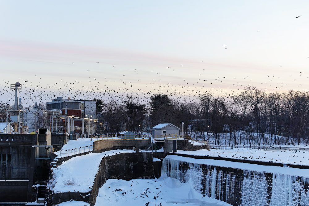 In addition to continuous incoming flight streams, thousands of crows gathered on the snow-covered river ice just upriver from the dam. This ice staging area served as a temporary assembly location, with birds repeatedly lifting off, resettling, and reshuffling as more arrivals poured in from all directions. The contrast of dark birds against bright snow and colorful sunset sky made the scale of the gathering especially striking.