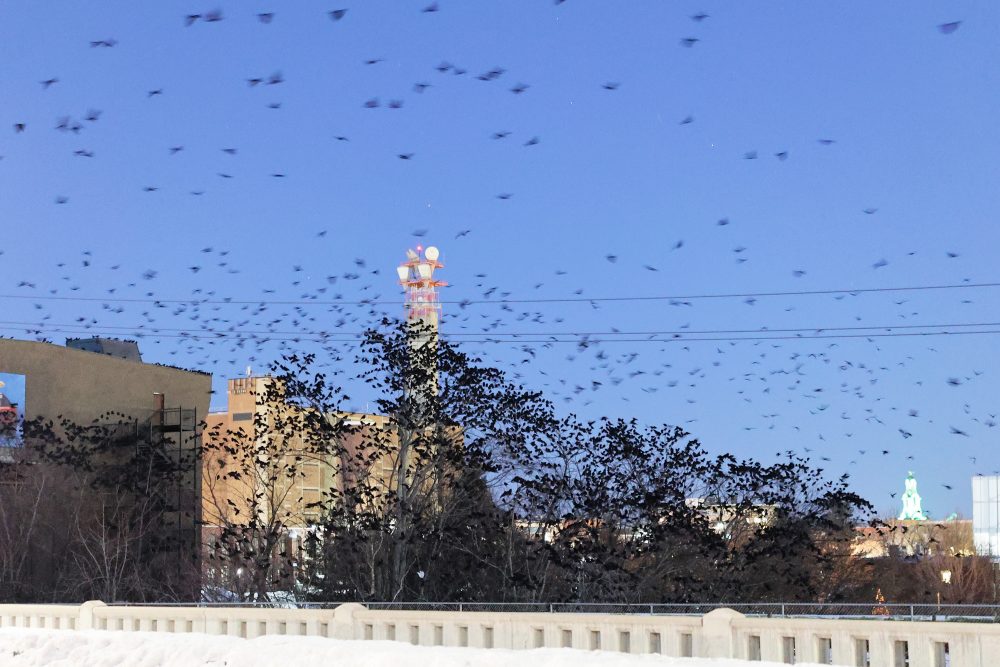 As dusk deepened, large numbers began concentrating in the trees at the far west end of Pemberton Park on the north side of the bridge. The steady accumulation here marked the final phase of the evening’s movement. This location has served as a regular overnight roost in prior winters, and once again it proved to be the focal point as the crows settled in for the night. Another dazzling winter crow spectacle, and a memorable evening out on Crow Patrol, made even better by welcoming visitors to share in the experience.