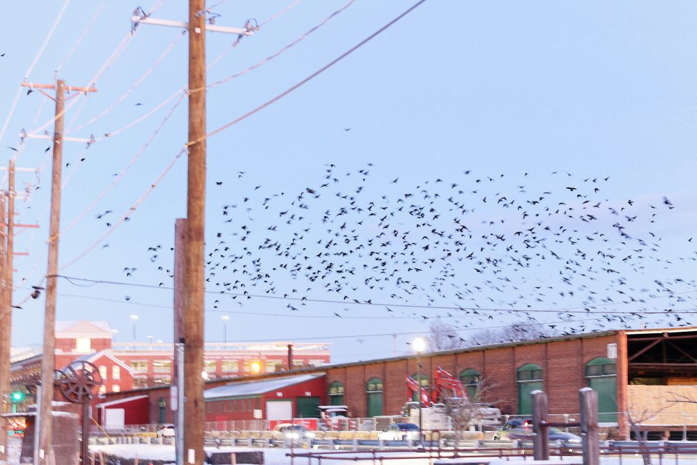 Out on Crow Patrol with initial stops at South Common, parking garage, then South Canal Street. The incoming Crows were streaming in and engaging in chaotic group flight action around the truck depot and the roof of the red brick CubeSmart building.