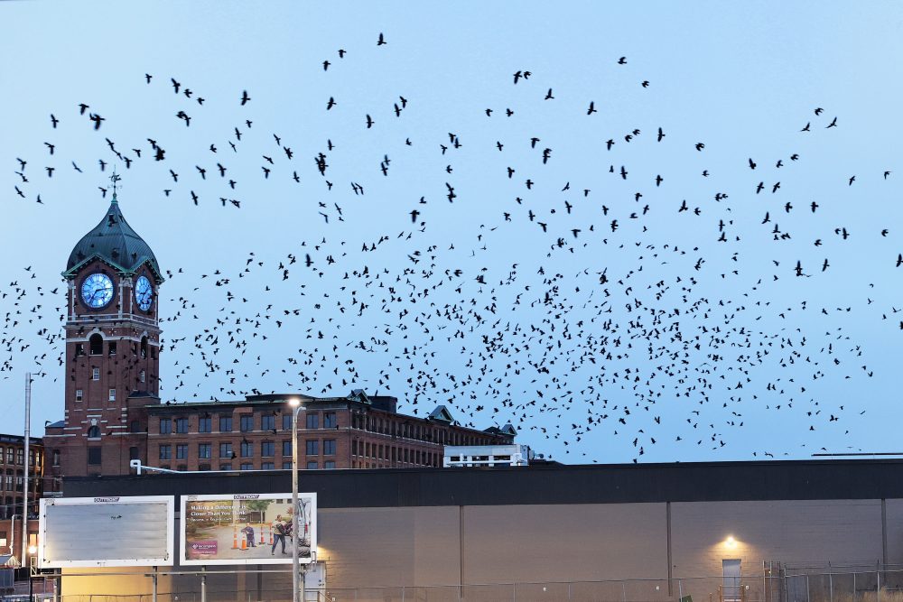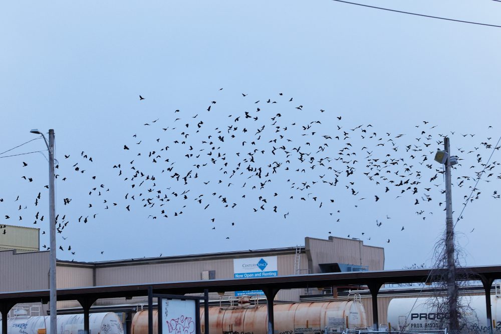 After many flight bursts, especially after a loud train roared by, the Crows shifted over to the western end of the nearby warehouse roof.