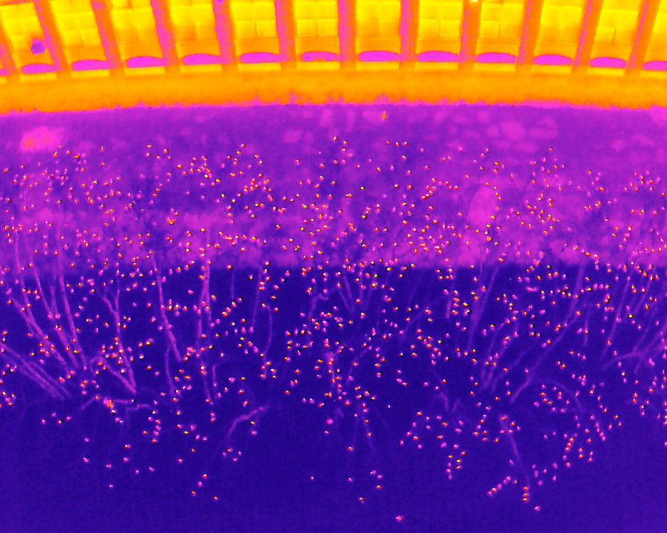As night time settles in, an orderly flight progression unfolds towards the roost trees with the Crows spread out all along the south side of the Merrimack River, but with the largest concentration seen by the New Balance building, the first time back since late fall. This amazing aerial thermal image below in a bright “Iron Red” color palette provides a sensational look at the roosting crows in trees along the river by the New Balance building. Another spectacular night out!
