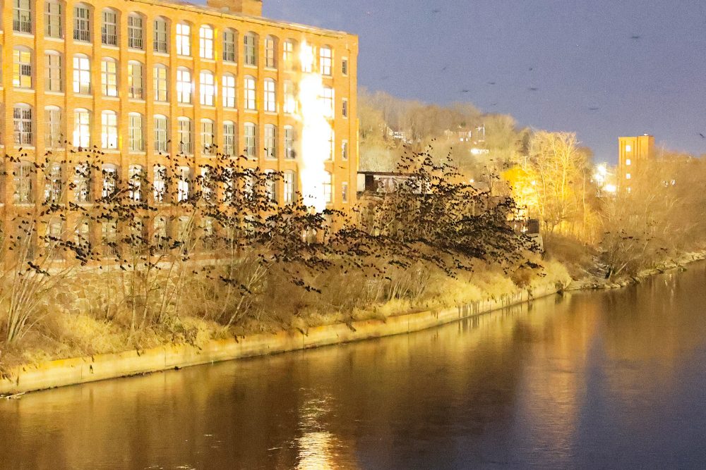 A unexpected and totally stunning and loud flight burst erupted out and over the Merrimack River around 110 minutes post sunset time. It seemed like almost all of the roosting Crows rose up and off in this wild flight burst. Another dazzling night out!