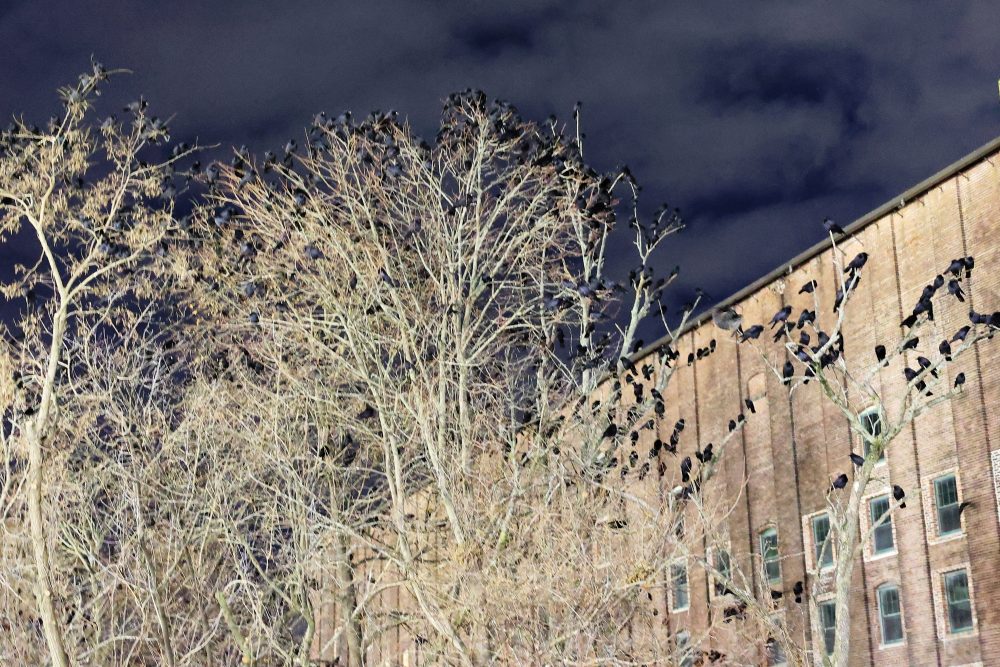 A bit later, went by the back of the hospital parking lots and found smaller groupings of roosting Crows almost all quieted down for the night. Image below at 79 minutes post sunset time.
