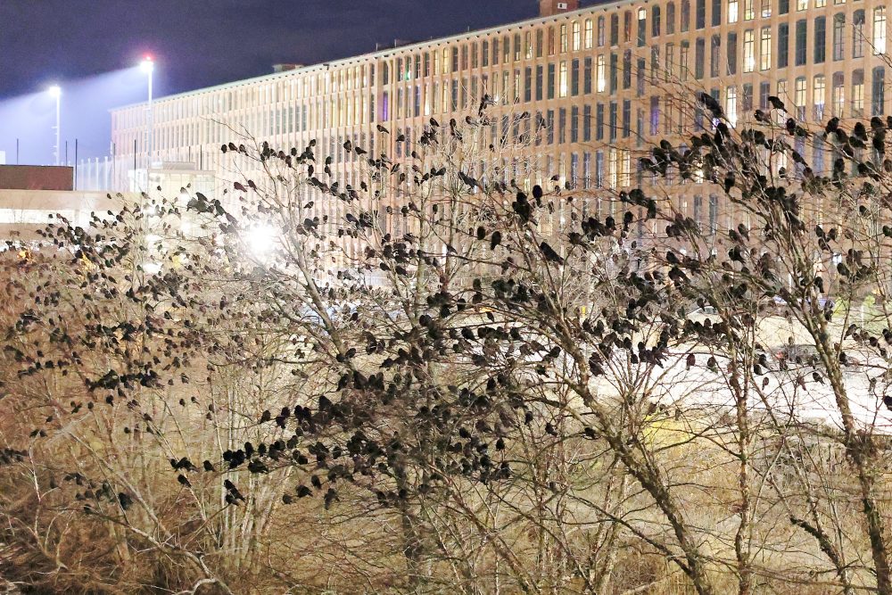 Out on Crow Patrol with first stop at final staging areas along the Merrimack River and north of the hospital. A large concentration of loud and boisterous Crows were seen at the far end of Island Street, near the entry path to the old Ferrous Site – one of the last redeveloped sites in the Gateway District. The 7.5‐acre site, located at the confluence of the North Canal and the Spicket and Merrimack rivers, for over 100 years hosted a foundry where machines and parts were forged to support the city’s textile and paper mills. When the foundry closed in the 1990s, it left behind multiple buildings and a large sprawling mound of spent burnt orange sand castings. An investment of about $164,000 in the city’s EPA Brownfields funding paid for the assessment of the Ferrous Site, leading to its cleanup and redevelopment and serving as a catalyst to the overall revitalization of the Lawrence Gateway. Image below at 25 minutes post sunset time.