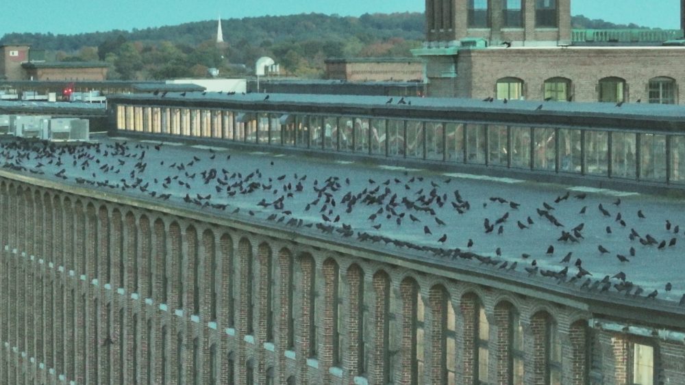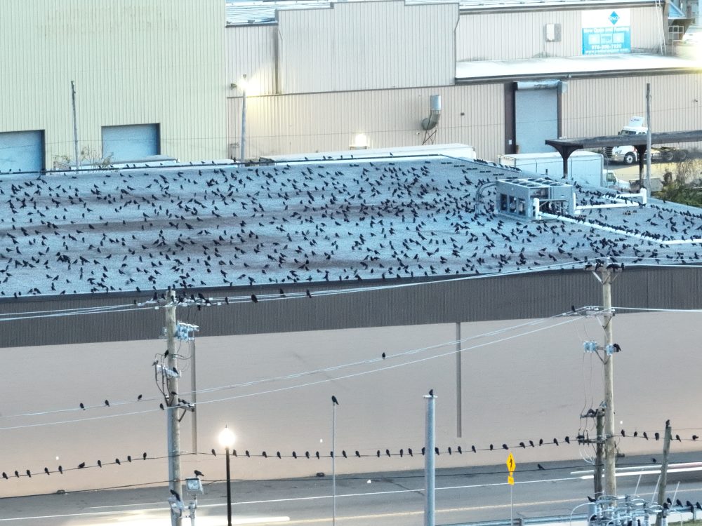 The biggest buildup was along both sides of Merrimack Street just west of the New Balance building. The Crows were on rooftops, utility wires, and on the ground and our pioneering work with aerial imaging provides a significant jump in sizing up and counting Crows in each location. The view below shows the west end of the former B&D Advanced warehousing building.
