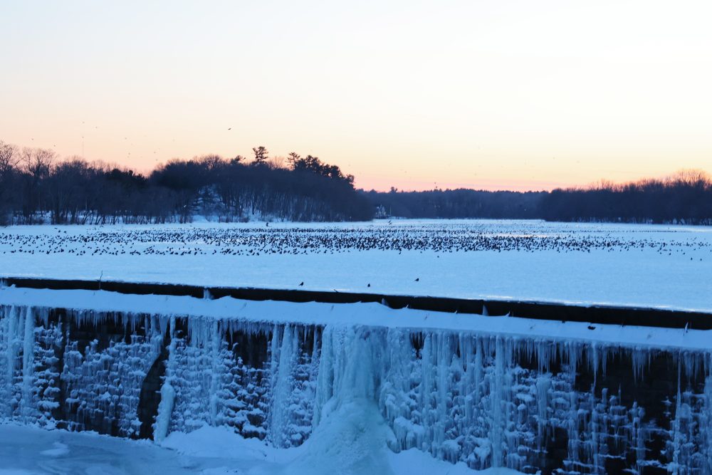 Just west of the dam, huge numbers of crows assembled on the river ice, offering outstanding views from the bridge. As wave after wave of incoming flight streams arrived, these ice-bound groupings expanded dramatically. Birds lifted off in short bursts, circled, and settled again, creating a constantly shifting mosaic of movement against the pale winter ice.