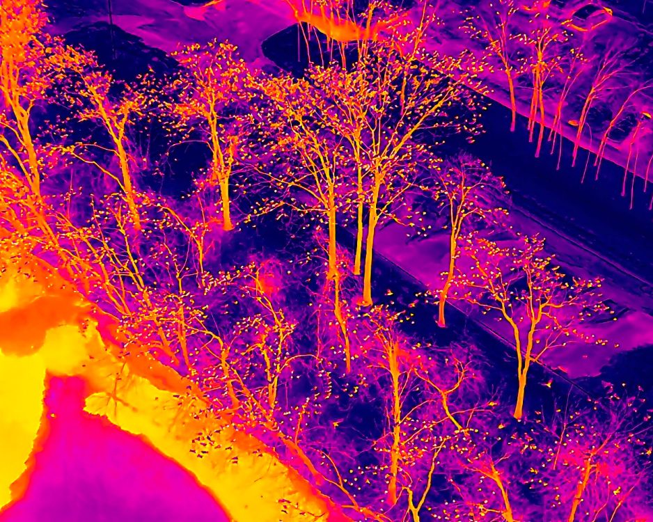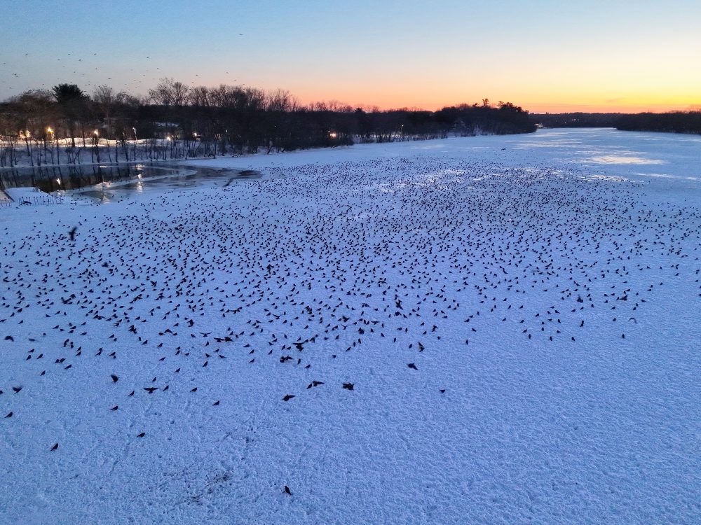 The overnight roost then filled in rapidly along this same stretch of riverside trees, extending from Broadway up toward Rowe Street. Numbers increased quickly as late arrivals poured in, and the line of trees became densely packed with perched birds as seen in the dynamic thermal aerial image below. Even as movement gradually slowed, reshuffling and calling continued well into the evening. Another dazzling winter crow show along the Merrimack, rich in sound, motion, and scale.