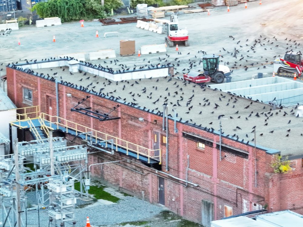 Just after sunset, the movement picked up. The crows streamed into the National Grid substation, filling every perch from rooftops, wires, fencing, and fixtures, to the ground below. This photo shows the Crows in growing numbers on the roof of the National grid substation.