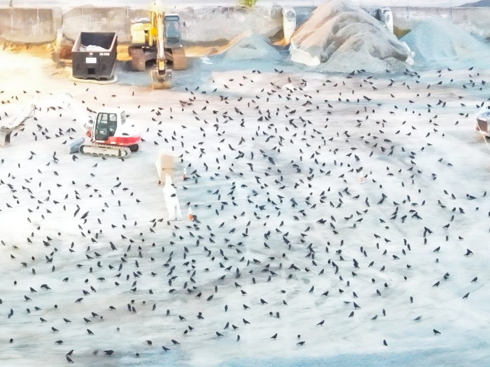 Minutes later the Crows arrived in bigger numbers and settled on the dirt ground inside the national grid substation. Photo below shows around 850 Crows on the ground.