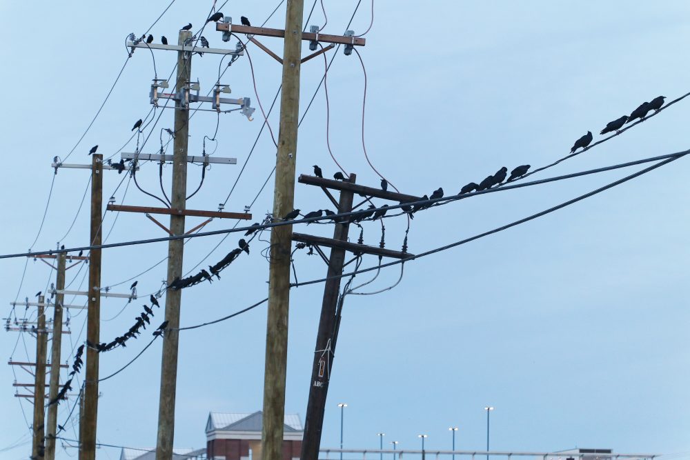 Along South Canal Street, small groups appeared first on rooftops, utility wires, and even the ground, early signs that numbers are slowly starting to build as the season changes. This photo shows the crows lined up on utility wires.