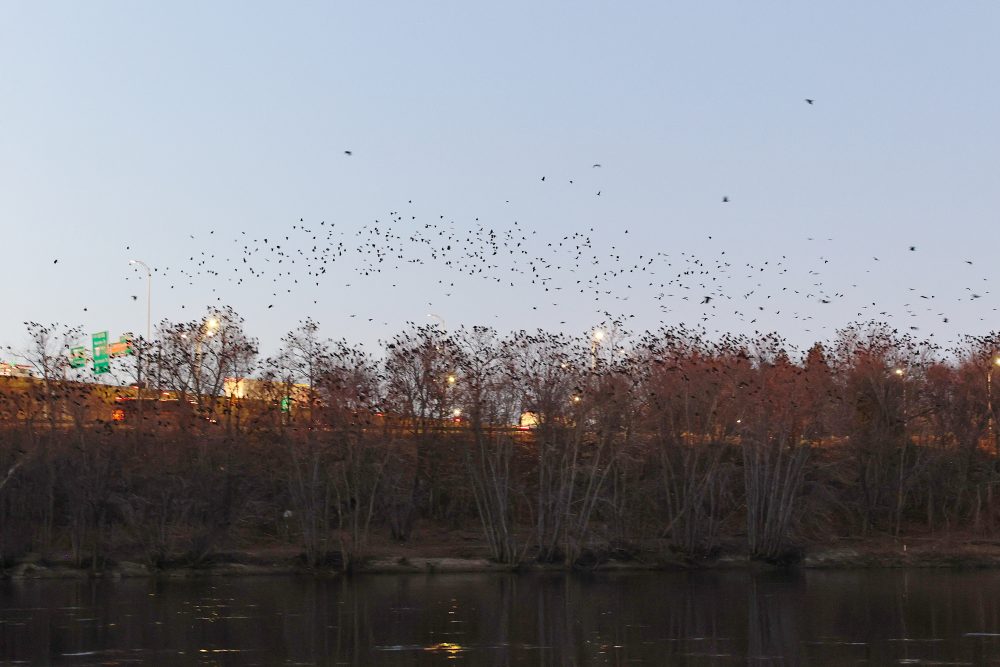 As flight streams rolled in from downriver, some dropped down into roost trees below, but many continued at higher altitudes, with loud vocalizing, and well above the Rt. 495 Bridge. They were headed farther to the west but it was not clear where they might settle. Image below at 38 minutes post sunset time.