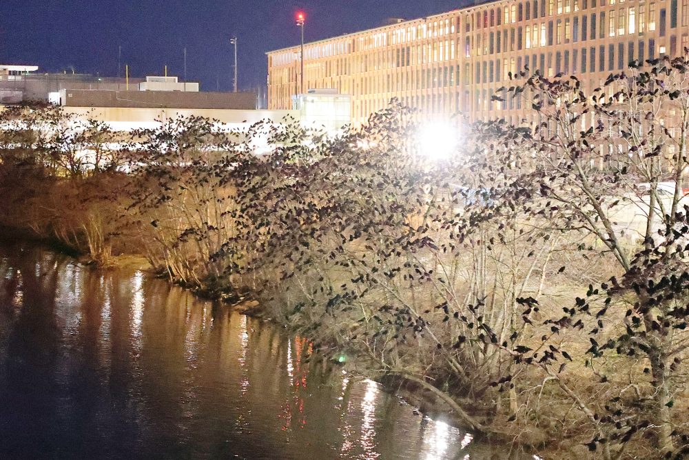 As darkness set in and the roost area by the bridge filled in and became more settled, the Crows made a number of spectacular and boisterous flight bursts over the river. Although this is a very normal event, it is astounding each and every time, particularly with such chaotic flight movements. Image below at 46 minutes post sunset time.